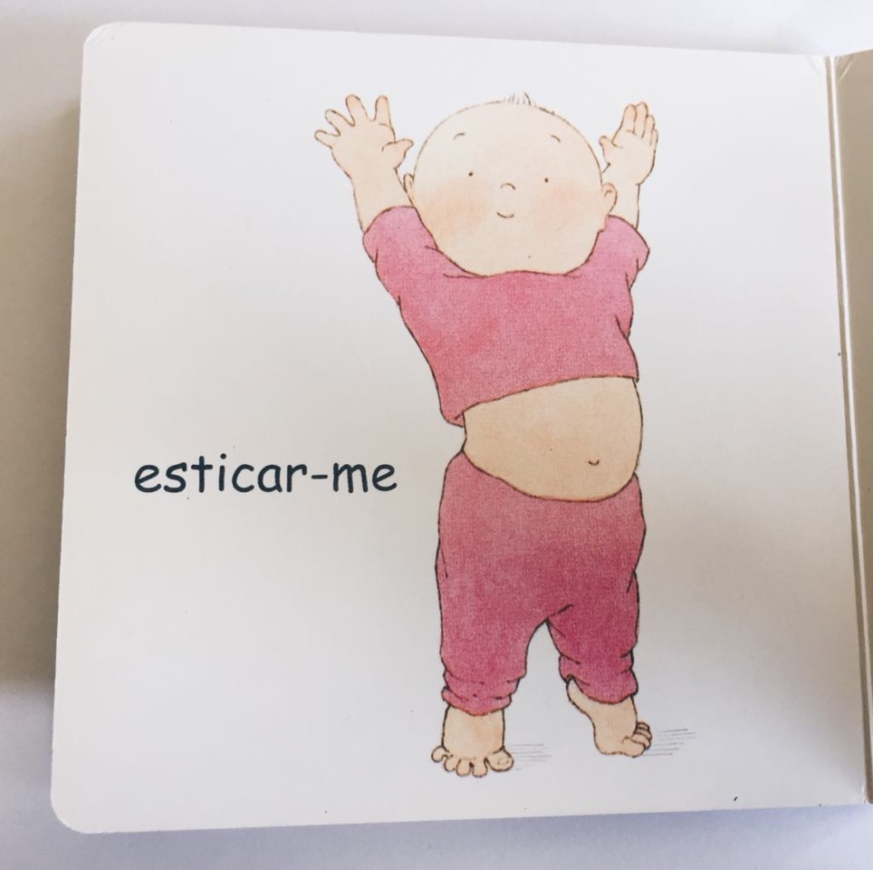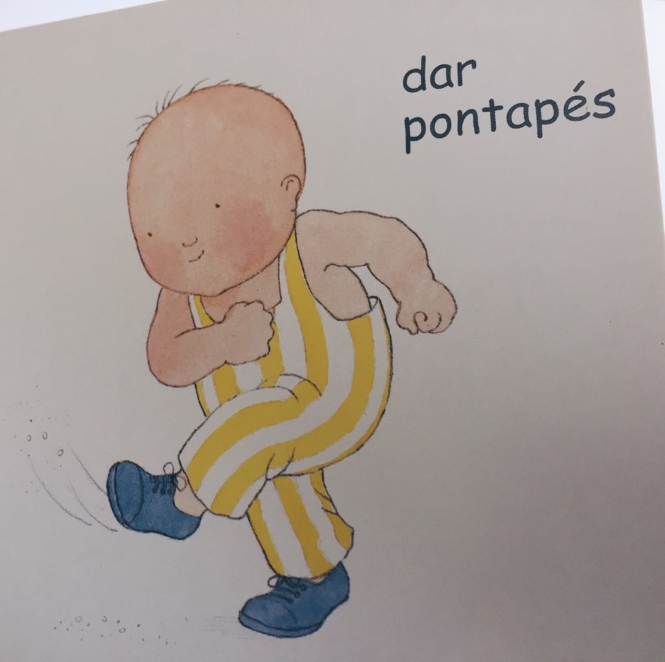 apreciação da pg: não ligou muito. aos 13 meses não se identifica, ainda, com muitas das ações apresentadas no livro (ainda não dá pontapés, não corre, não dança (em pé), não bate o pé (graças aos céus), não salta… por isso não sentiu atraída. tentei três vezes ler com ela, deixei-o para exploração livre, e passadas duas páginas ignorava-o. livro para apresentar novamente após a aquisição das competências físicas apresentadas.
