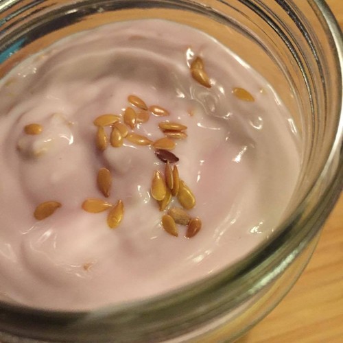 mistura as sementes de linhaça com o iogurte envolvendo bem. coloca sobre a fruta.