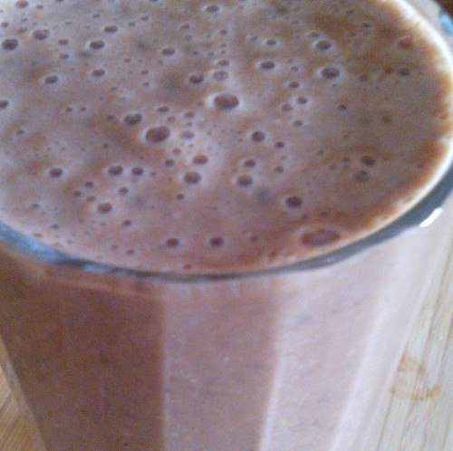 coloca as sementes de chia no leite e deixe repousar por 30m. junta todos os ingredientes (exceto o gelo) na liquidificadora e tritura bem. Acrescenta o gelo e tritura novamente.