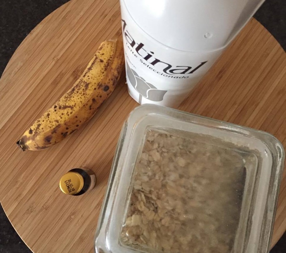 .2 colheres (sopa) de flocos de aveia .3 colheres (sopa) de leite (de origem animal ou vegetal - eu usei de soja magro) .1 banana .1 iogurte magro (sólido)