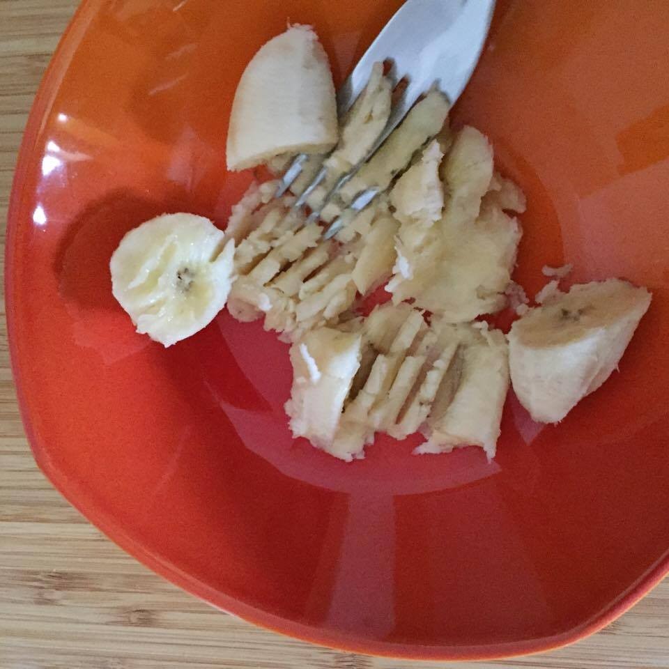 .1. esmaga as bananas com um garfo. adiciona os ovos inteiros. a canela a gosto. envolve bem.